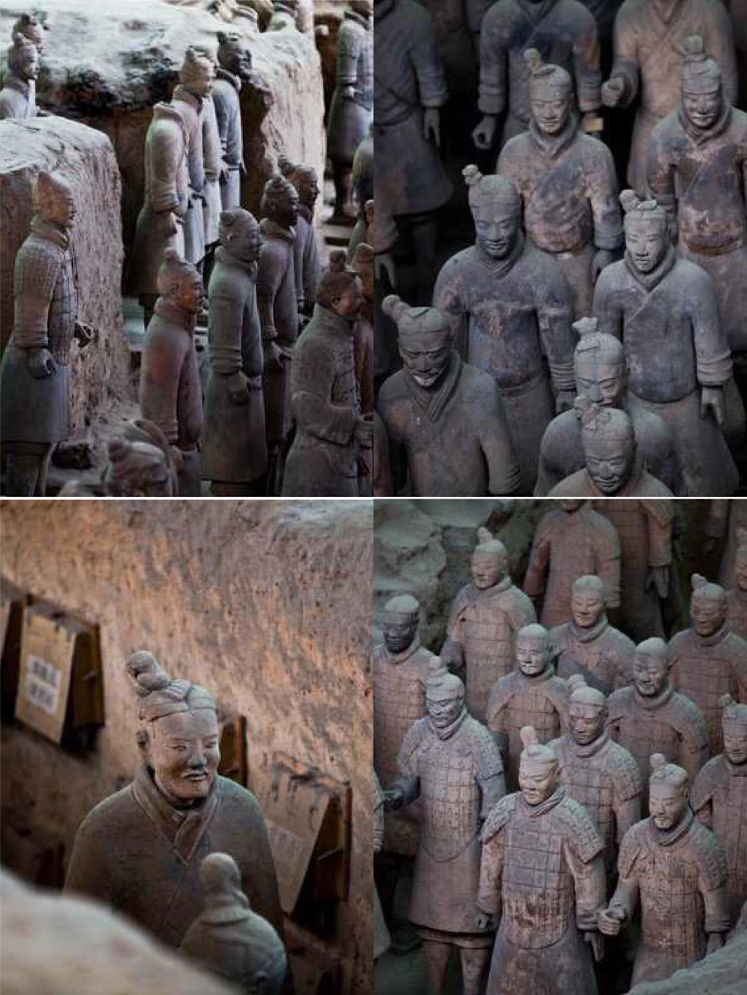 俗話說:“北京看城頭,西安看墳頭”。兵馬俑陪葬坑坐西向東,三坑呈品字形排列。最早發(fā)現(xiàn)的是一號(hào)俑坑,呈長方形,坑里有8000多個(gè)兵馬俑,四面有斜坡門道。一號(hào)俑坑左右兩側(cè)各有一個(gè)兵馬俑坑,稱二號(hào)坑和三號(hào)坑。隨之出土的還有兩個(gè)銅馬車,銅車比例與實(shí)際比例為1:2,車馬的冶金鑄造技術(shù)也令人驚嘆~坑?xùn)|端有三列橫排武士俑,手執(zhí)弓弩類遠(yuǎn)射兵器,似為前鋒部隊(duì),其后是6000鎧甲俑組成的主體部隊(duì),手執(zhí)矛、戈戟等長兵器,同35乘駟馬戰(zhàn)車在11個(gè)過洞里排列成38路縱隊(duì)。