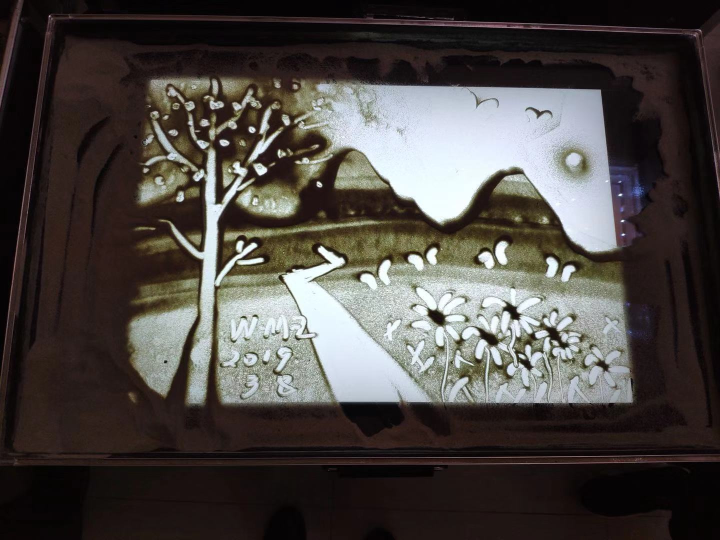 沙畫算是一門小眾藝術,大家都是第一次接觸。在沙畫老師的示范和教學下,大家也都完成了屬于自己的沙畫作品,還有畫沙畫中的一些技巧:例如拍太陽,拍太陽主要就是追求一種暈染的效果,讓太陽有光的朦朧感,這就要求下手干凈利落,用力均勻,只能拍一下,一拍成型!