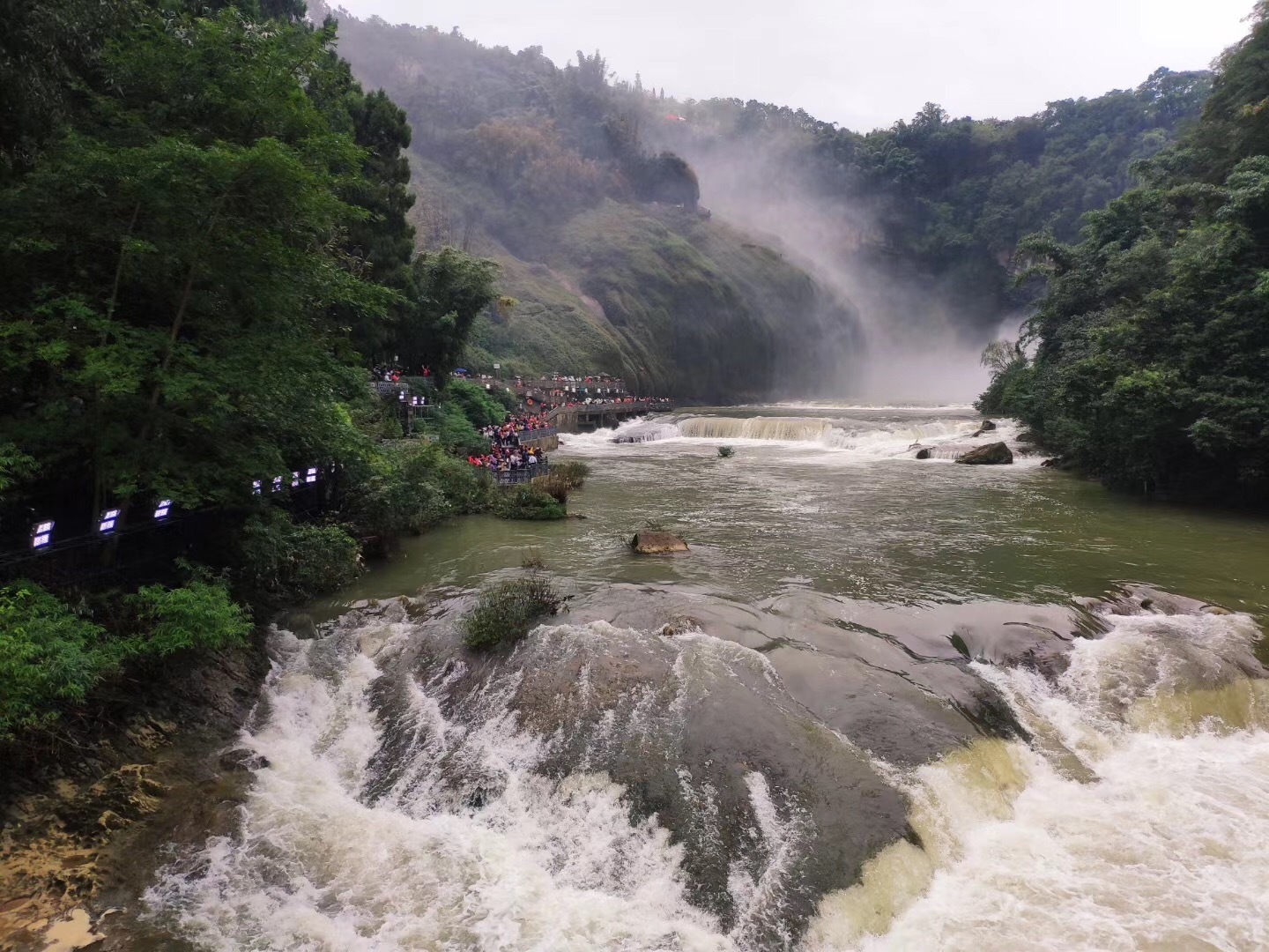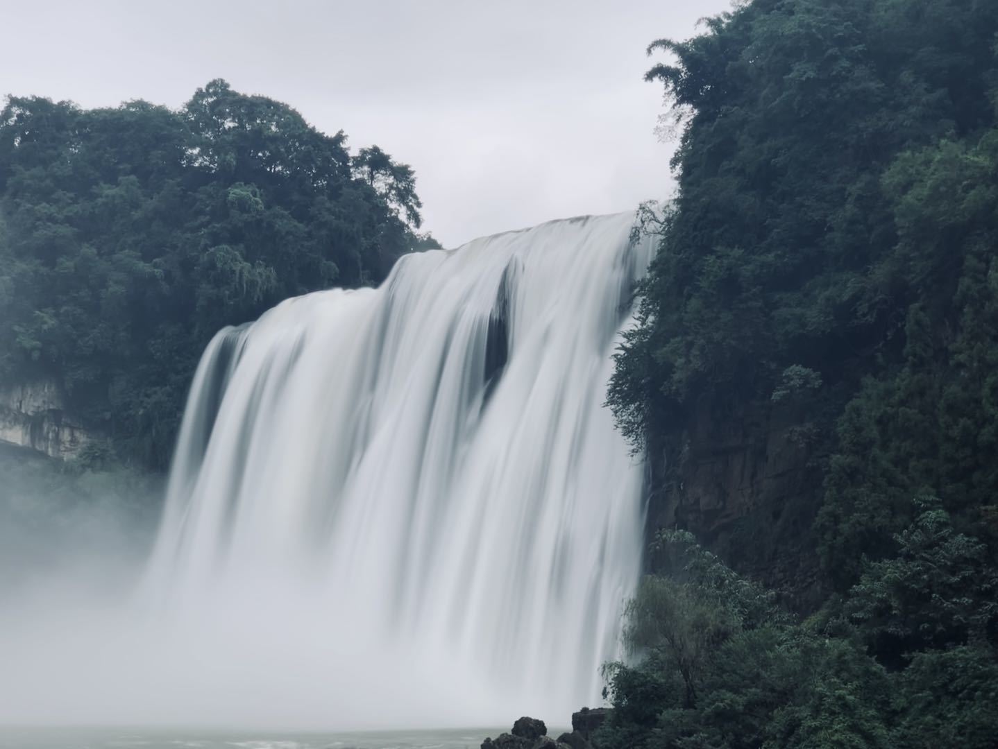 數(shù)日游覽雖不能盡覽貴州盛景,但是行程中安排的每一個景點(diǎn)都是貴州名勝的代表。黃果樹瀑布,在網(wǎng)上看了再多的的描述都不如現(xiàn)場感受的深刻。到達(dá)景區(qū),還沒有看見黃果樹瀑布,卻已經(jīng)聽到它像打雷般轟隆隆聲并伴隨著流水的嘩啦啦聲,震耳欲聾。沒走多遠(yuǎn)眼前就出現(xiàn)水簾懸掛的壯觀景象,只見一股巨大的水流奔騰著、咆哮著,像千軍萬馬般洶涌地從山頂上凌空而下。不愧是世界著名大瀑布之一。