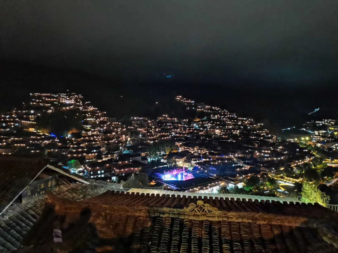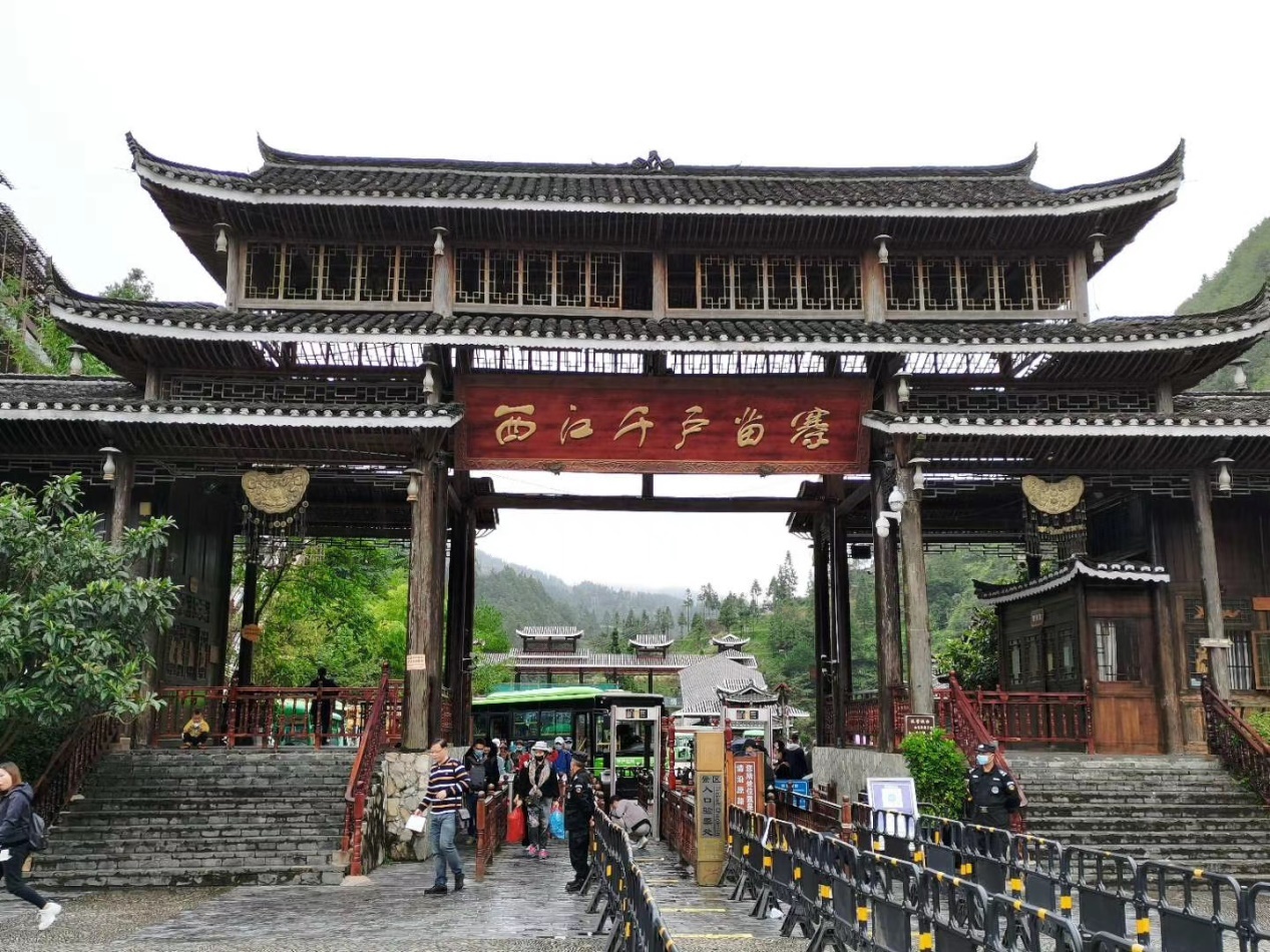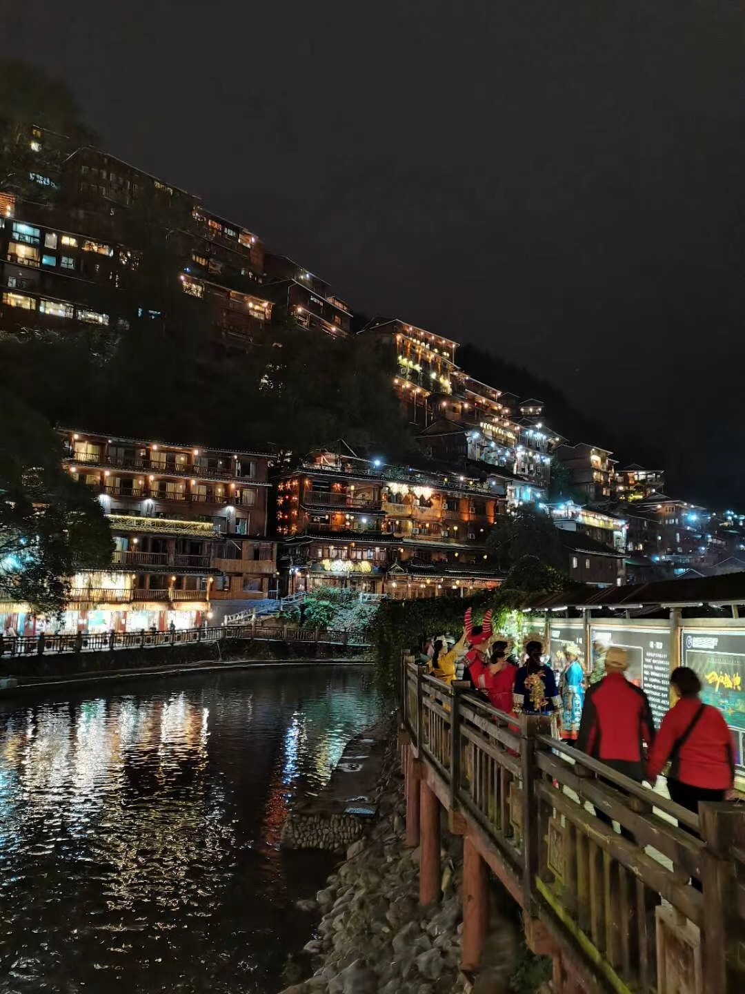 告別了小七孔,我們一行人來到了西江千戶苗寨。清澈見底的白水河穿寨而過,苗寨坐落于河流東北側(cè)的河谷坡地上。千百年來,西江苗族同胞在這里日出而耕,日落而息,在苗寨上游地區(qū)開辟大片的梯田,形成了農(nóng)耕文化和田園風(fēng)光。不同于白天的匆忙,晚上隨著街上飄著的飯菜香以及小販的吆喝聲,這都讓人感到很愜意。我們坐景區(qū)觀光車前往山上的望景臺,站在臺上俯瞰整個苗寨,看著燈火輝煌的夜景,我們互相交流著,似乎此時的任何感受都能引起大家的共鳴。