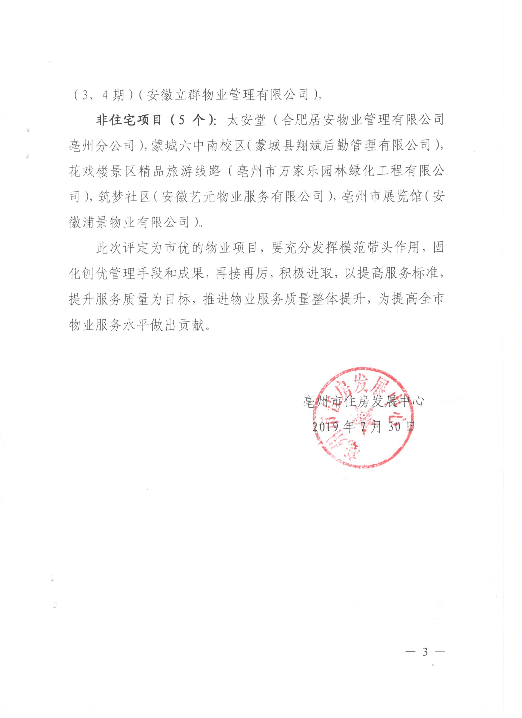 蒙城名邦·中央公館榮獲“亳州市物業(yè)管理優(yōu)秀住宅示范小區(qū)”稱號(hào)