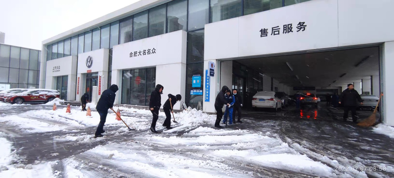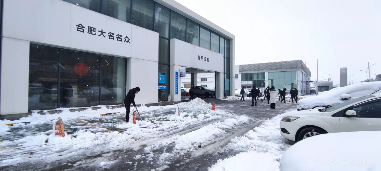 2022年2月7日是節(jié)后上班的第一天,同時也迎來了2022年的第一場大雪,本次大雪給交通出行帶來了不便,為此合肥大名名眾全體員工全力備戰(zhàn),不畏嚴(yán)寒,砥礪前行 ,掃除積雪,為保證顧客到店不受雪天路滑影響,以雪為令,雪停即掃。