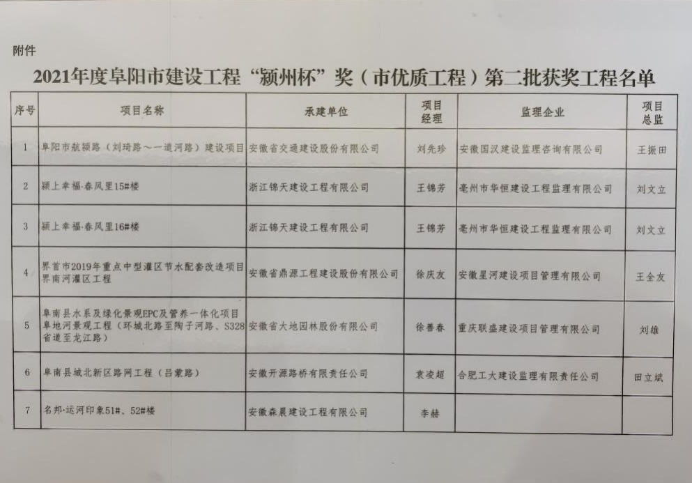 阜陽市建設(shè)工程“潁州杯”獎(jiǎng)是阜陽市建設(shè)工程質(zhì)量的較高獎(jiǎng)項(xiàng),其申報(bào)條件較高,評選過程嚴(yán)苛。申報(bào)工程必須是上一年年底前竣工的工程,經(jīng)過冬、夏季節(jié)的使用檢驗(yàn),未發(fā)生質(zhì)量缺陷和質(zhì)量隱患,且未改變原設(shè)計(jì)用途,各項(xiàng)技術(shù)指標(biāo)和經(jīng)濟(jì)效益指標(biāo)達(dá)到本專業(yè)市內(nèi)先進(jìn)水平。在評選過程中,工程質(zhì)量現(xiàn)場復(fù)查組實(shí)地檢驗(yàn)了工程質(zhì)量狀況,當(dāng)場隨機(jī)抽取住戶并聽取住戶對工程質(zhì)量的意見,聽取了建設(shè)、使用、設(shè)計(jì)、監(jiān)理及質(zhì)量監(jiān)督單位對工程質(zhì)量的評價(jià)意見。對審定通過的工程,在阜陽市建筑信息網(wǎng)站上進(jìn)行為期10天的公示。