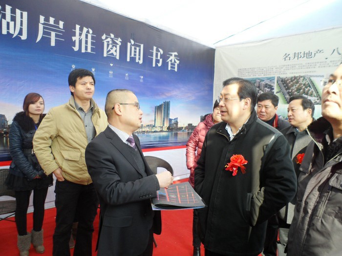 開幕式結(jié)束后市委常委、縣委書記袁方、副縣長(zhǎng)石東升及相關(guān)領(lǐng)導(dǎo)第一個(gè)參觀我公司現(xiàn)場(chǎng)售樓部親切交談,認(rèn)真聽取總經(jīng)理許勝先生詳細(xì)介紹名邦學(xué)府項(xiàng)目建設(shè)、工程進(jìn)度及銷售情況,并征詢企業(yè)在發(fā)展的困難。