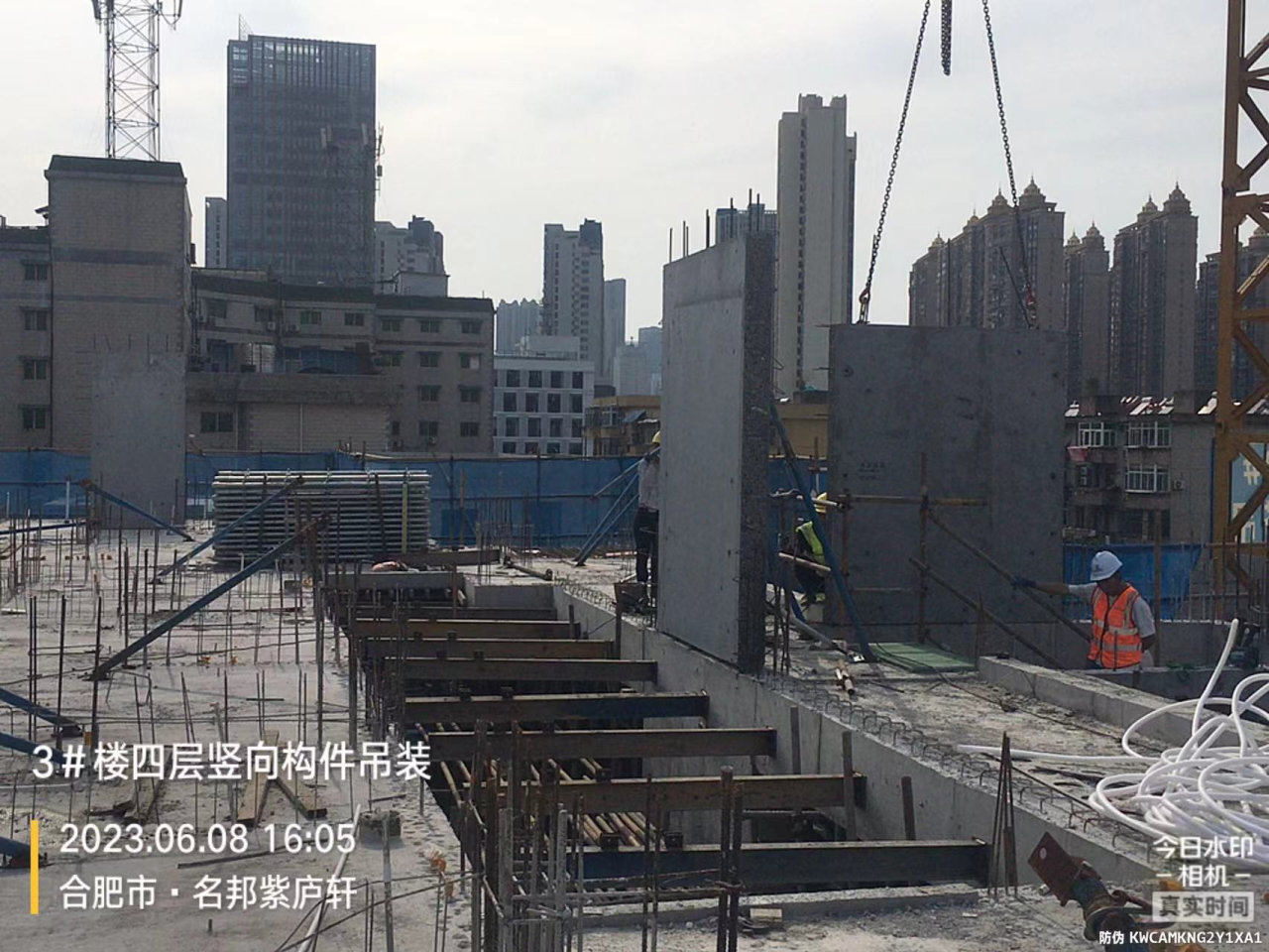 名邦·紫廬軒項目3#樓自今年3月初基礎(chǔ)及主體結(jié)構(gòu)施工以來,克服合肥春季多雨影響,從前期設(shè)計籌劃、裝配式構(gòu)件深化設(shè)計到5月5日3#樓四樓轉(zhuǎn)換層的第一次裝配式構(gòu)件疊合板進(jìn)場,再到6月8日四層豎向構(gòu)件吊裝施工,每一道施工工序皆順利落定、有序推進(jìn)。