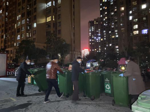 晚八點(diǎn)開始,抗疫工作小組成員的身影將在樓棟里交錯(cuò)停留近4小時(shí),他們將生活垃圾從頂層至一樓逐一清運(yùn),清運(yùn)后的垃圾桶運(yùn)至樓下進(jìn)行消毒,垃圾傾倒后再次進(jìn)行消毒。為避免交叉感染,該棟樓垃圾桶實(shí)行“專桶專用”,與園區(qū)垃圾桶區(qū)分存放。