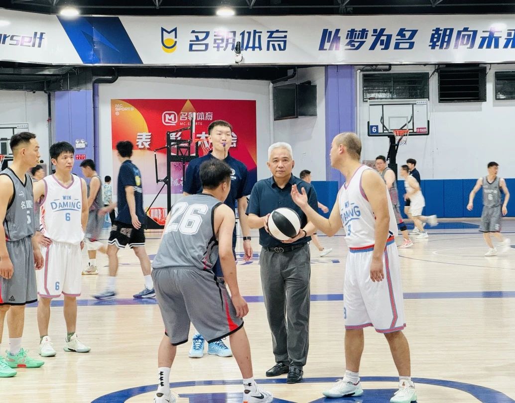 圖為大名集團行政總監(jiān)王光渺為籃球5v5對抗賽決賽開球